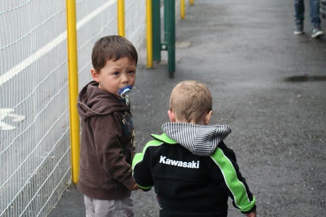 Voila encore un petit mot à la concurrence voici probablement les futurs pilotes de la DRC le jeune Adrian LAMBOT (veste Kawasaki) et Liam FLENER. Semblait un duo inséparable et foux de la moto. Prenez déjà l'habitude de voir que leurs dos!