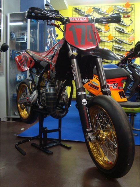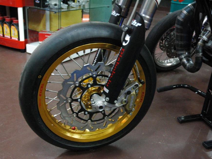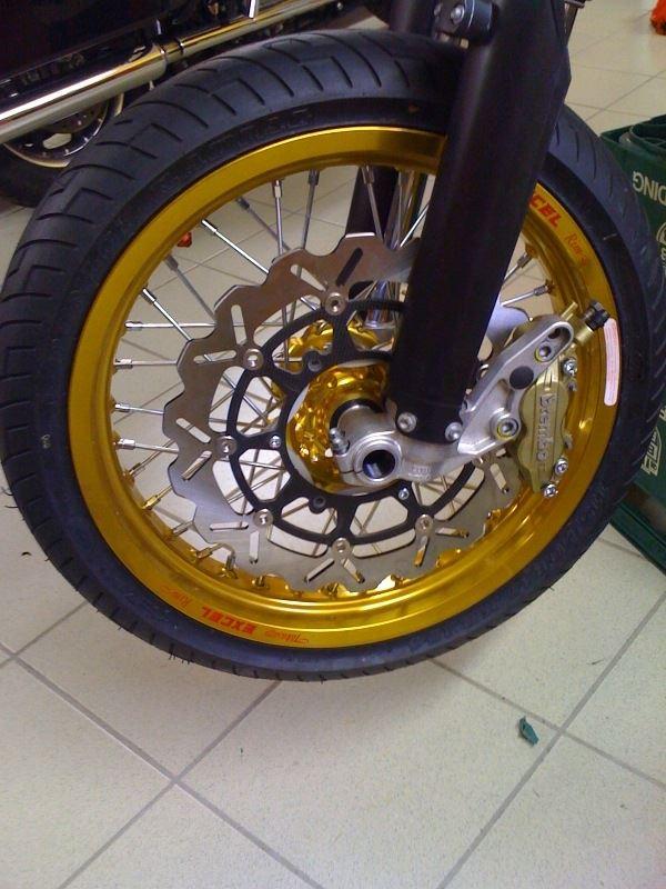 Mais c'est les jantes d'oré les vrais bijoux de cette Supermotard, une fabrication sur mesure de la maison Exel avec moyeux de roues Talon. Chaussées en gomme Dunlop KR133 et KR149 pour garantir un grip optimal dans toutes les situations.