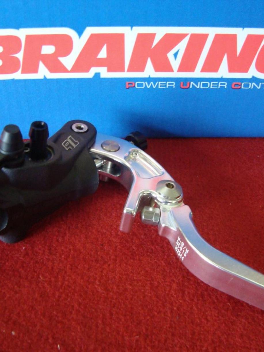 Maintenant une pompe radial de 16mm de Braking alimente un étrier Brembo de 4 pistons qui mort dans un disque de frein Braking Wave Flotting Over Size avec moyeaux en carbon.