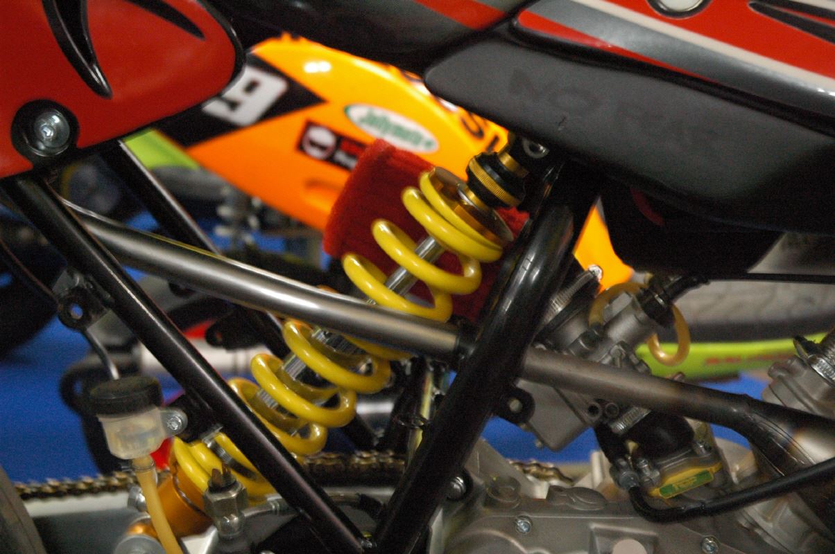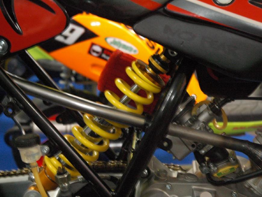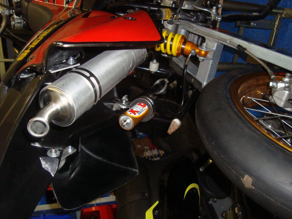 En total il reste encore 5 pièces d'origines du cadre de la SHERCO, le cadre même, le réservoir, la selle, les carrénages du coté. La fourche a était remplacé par une White Power Up-Sidedown d'une KTM. Vu la surdimention de la fourche on avait besoin d'un amortisseur à la mesure qui harmonise avec la fourche Over size que Kundo nous a fabriqué. Le amortisseur Kundo KRD est réglable en détente via une molette de 32 clics et la précharge du ressort est ajustable.
